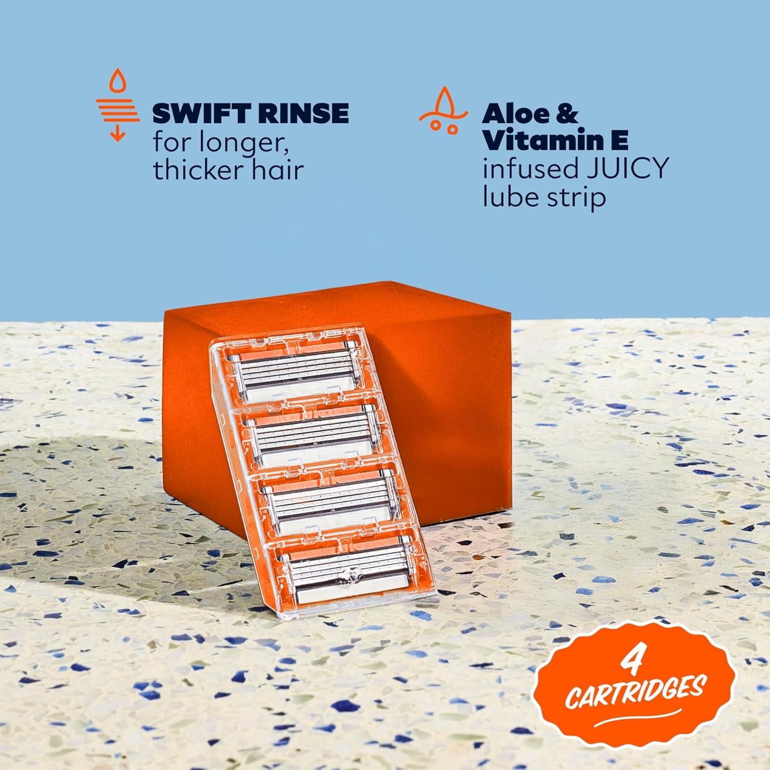 The Swift Rinse Blades feature four blades designed for easy rinsing, wide enough to allow thick and long hair to pass through. JUICY Lubricant Strip for comfort and glide. Tackle the wildest of hair forests, whether they grow on the face, armpits or legs. The lubricant strip is moisturizing to keep things smooth. Fresh shaves call for fresh blades, quality blades for quality shaves on your quality face.